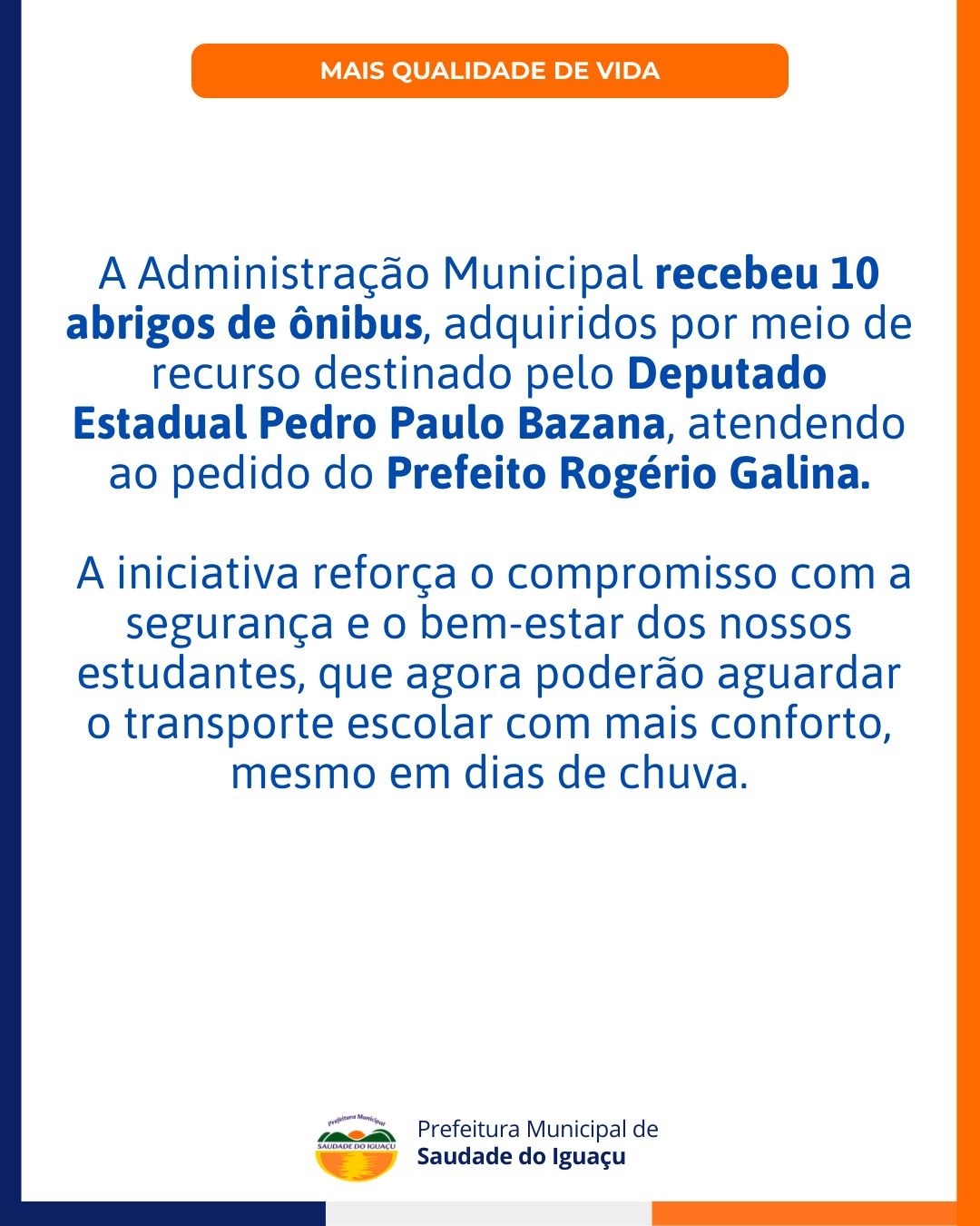 A Administração Municipal recebeu 10 abrigos de ônibus, adquiridos por meio de recurso destinado pelo Deputado Estadual Pedro Paulo Bazana, atendendo ao pedido do Prefeito Rogério Galina.