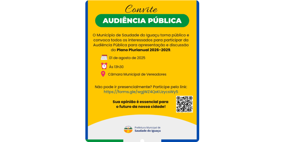 A Prefeitura de Saudade do Iguaçu convida toda a população para participar da Audiência Pública do Plano Plurianual (PPA) 2026-2029.