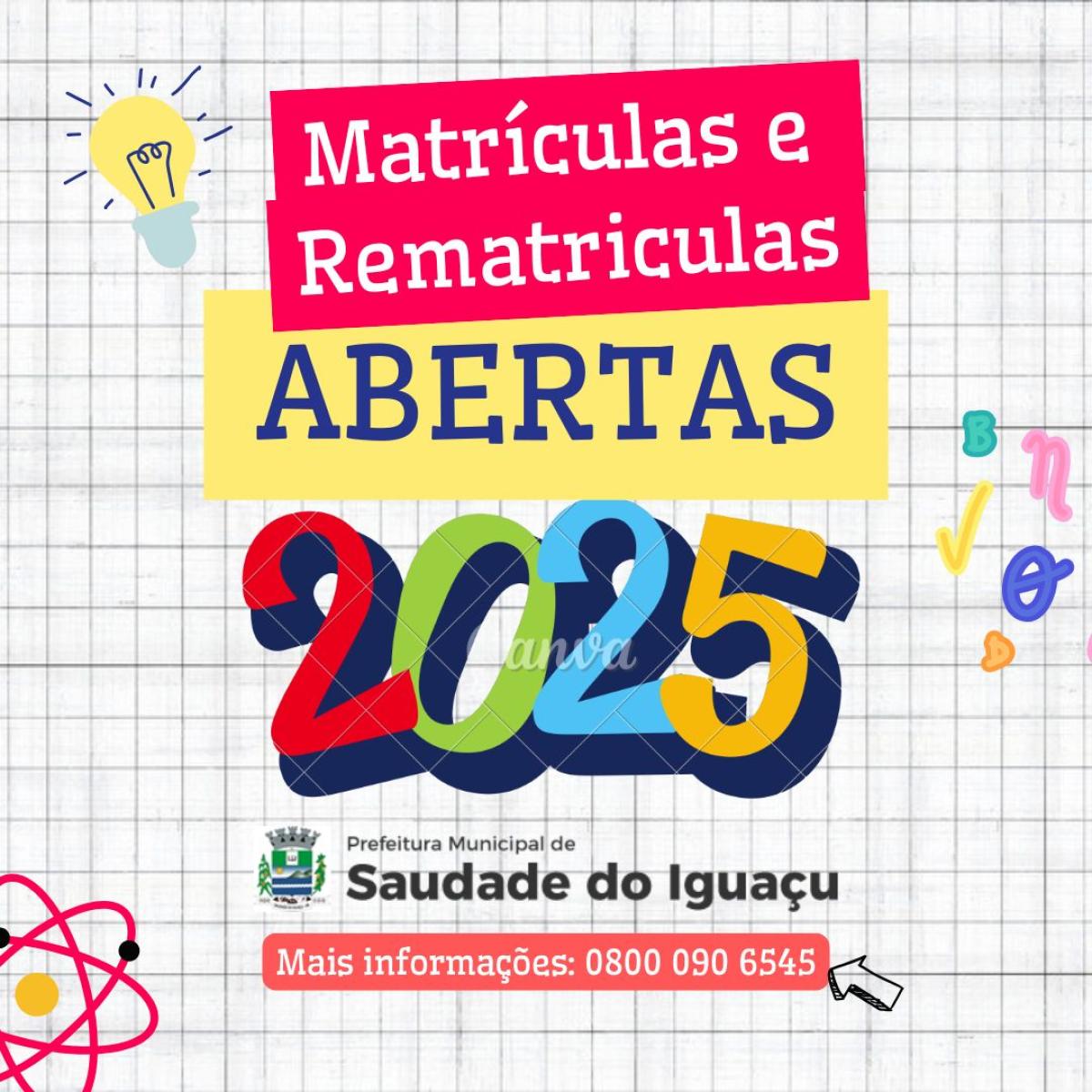 A Prefeitura de Saudade do Iguaçu, por meio das escolas e centros de educação infantil municipais, informa aos pais e responsáveis o cronograma de matrículas e rematrículas para o ano letivo de 2025. As inscrições serão realizadas nas datas e horários estabelecidos para cada turma e faixa etária, conforme os comunicados específicos de cada instituição.