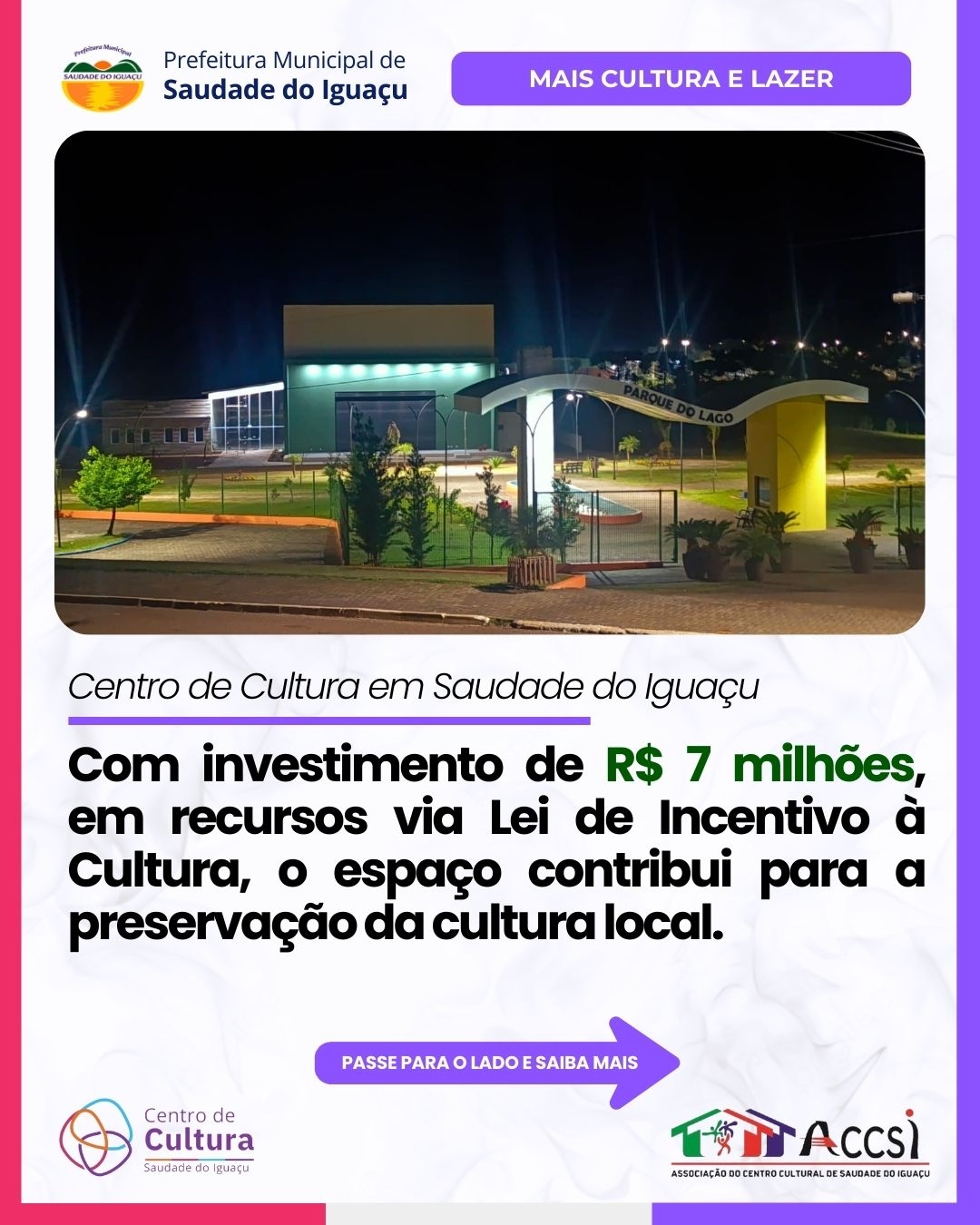 Localizado na Avenida Iguaçu, anexo ao Parque do Lago, no Centro de Saudade do Iguaçu, o empreendimento de 1.160 metros quadrados oferece estrutura para cinema, teatro, oficinas e biblioteca. A cerimônia de inauguração oficial começa às 18h45, com apresentações artísticas, e será encerrada com show do grupo Os Monarcas a partir das 21h.