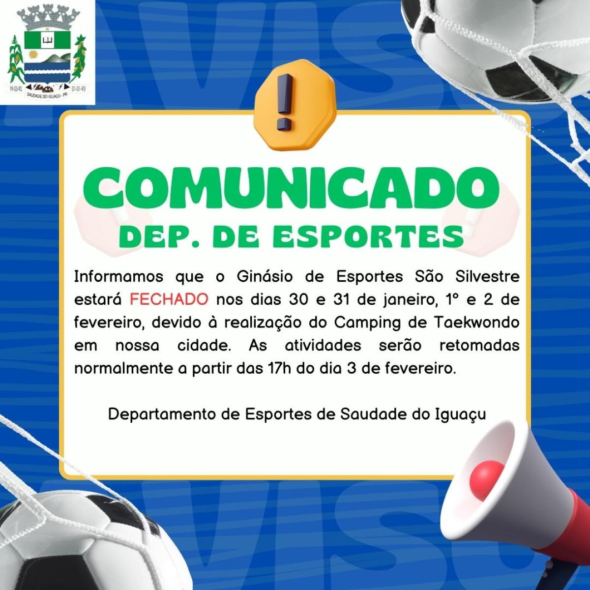 O Ginásio de Esportes São Silvestre estará fechado nos dias 30 e 31 de janeiro, 1º e 2 de fevereiro, devido à realização do Camping de Taekwondo em nossa cidade. Durante esse período, o local não estará disponível para atividades regulares.