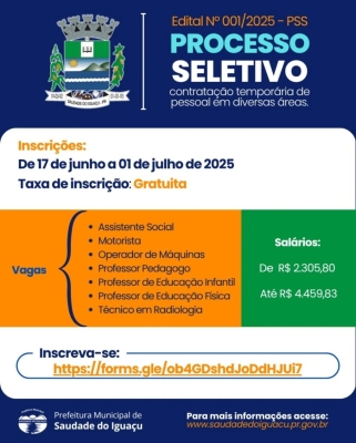 Prefeitura de Saudade do Iguaçu abre Processo Seletivo Simplificado com vagas em diversas áreas