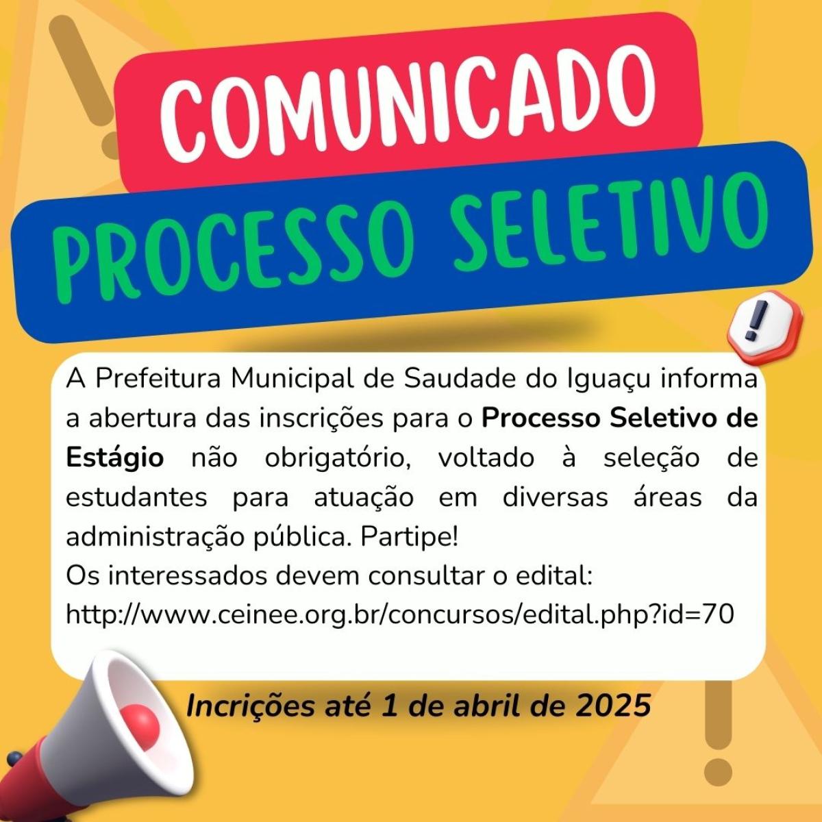 A Prefeitura Municipal de Saudade do Iguaçu, em parceria com o Centro de Integração Nacional de Estágios para Estudantes (CEINEE), torna público o edital do Processo Seletivo para Estágio Não Obrigatório.