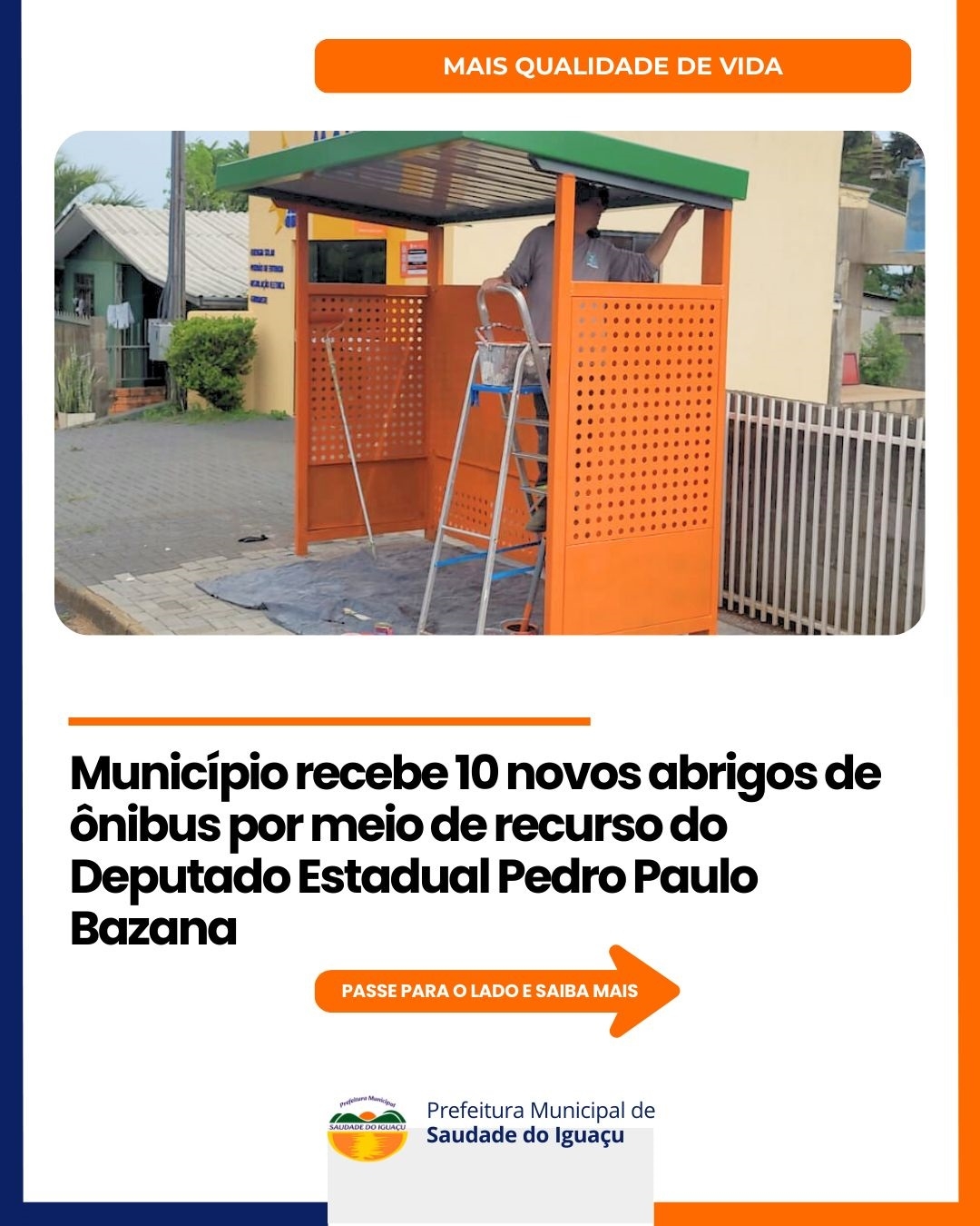 A Administração Municipal recebeu 10 abrigos de ônibus, adquiridos por meio de recurso destinado pelo Deputado Estadual Pedro Paulo Bazana, atendendo ao pedido do Prefeito Rogério Galina.